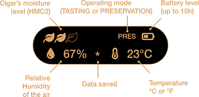Equipped with its humidor cap inside the humidor, the H1 calculates and displays the relative humidity (RH) level required to reach the desired HMC2 level (one, two, or three leaves) based on the current temperature inside the humidor. After collecting automatically the data (*) at 10, 20, or 30 minutes, the H1 will provide suggested adjustment settings.